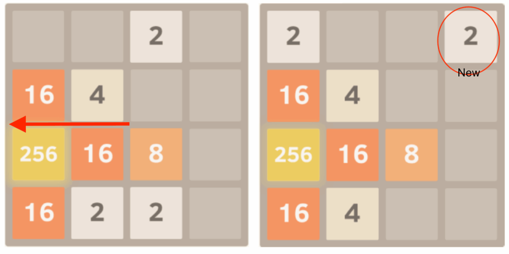 Рис.1 Пример хода в 2048. После хода “сдвиг влево” (left) на левой доске. Доска слева станет той, что расположена на рис. справа.